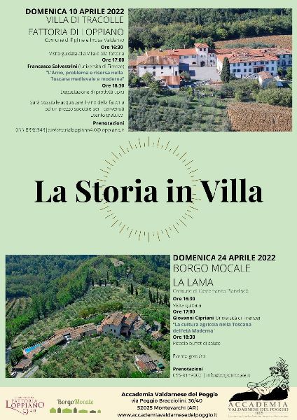 L’Accademia Valdarnese del Poggio riprende in Aprile la serie di conferenze ‘La Storia in Villa’ che si propone di offrire approfondimenti storici sulle vicende del Valdarno e della Toscana attraverso i secoli in luoghi che di quella storia portano ancora il segno: le Ville e fattorie storiche del territorio valdarnese, testimoni del lavoro, della creatività e del genio artistico di secoli.