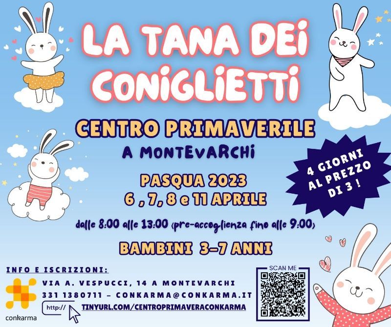 Il 6, 7, 8 e 11 aprile 2023 Conkarma propone a Montevarchi il suo centro primaverile La tana dei coniglietti, un servizio in aiuto delle famiglie durante la pausa scolastica.