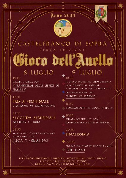 Terza edizione del gioco dell'anello a Castelfranco di Sopra nei giorni dell'8 e 9 Luglio in piazza Vittorio Emanuele a Castelfranco di Sopra con sport, sfilate, musica, mercatini artigianali e enogastronomici e tanto altro ancora!