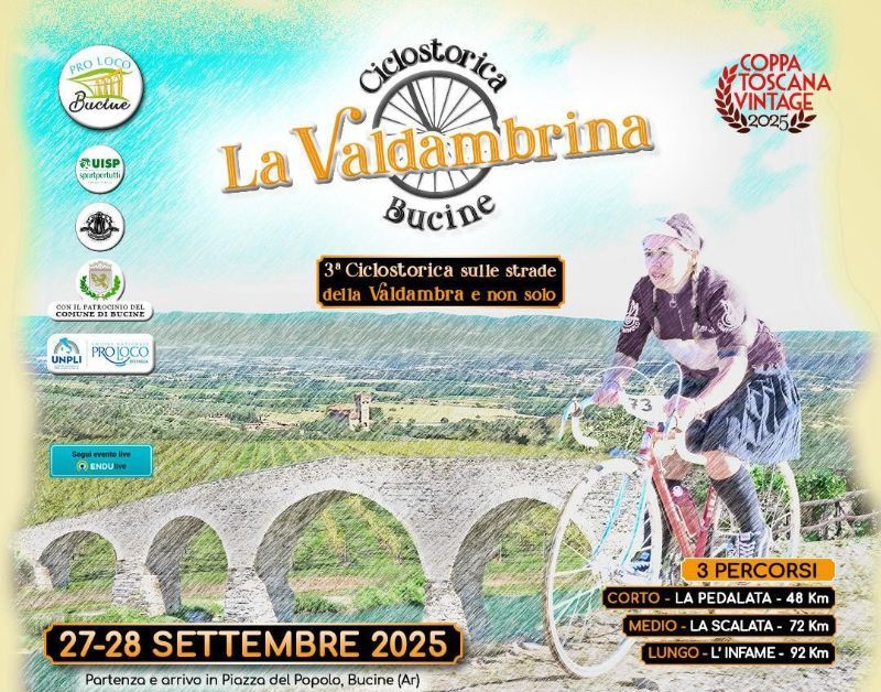 Fine settimana su due ruote con la Valdambrina Ciclostorica, decima tappa dell'edizione della Coppa Toscana Vintage 2025; appuntamento dunque Sabato 27 e Domenica 28 Settembre per la terza edizione con partenza ed arrivo in Piazza del Popolo, il cuore del centro storico del paese Bucine; per i ritardatari l'iscrizione sul posto sarà possibile al costo di €.30