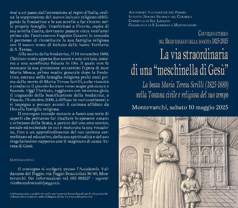 Sabato 10 maggio, nella Sala Grande dell’Accademia Valdarnese del Poggio di Montevarchi, si terrà un convegno storico per ricordare la beata Maria Teresa Scrilli nel Bicentenario della nascita (1825-2025).