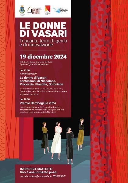Lo spettacolo, prodotto dall’associazione culturale rumorBianc(o), dal titolo “Le donne di Vasari: confessioni di Niccolosa, Properzia, Plautilla, Sofonisba”, in omaggio al contributo delle figure femminili nell’arte e nella storia e a Giorgio Vasari (nell’anno in cui si celebrano i 450 anni dalla sua morte), che fu tra i primi a riconoscerne il talento e a celebrarle nella sua opera più famosa, “Le vite de’ più eccellenti pittori, scultori e architettori”; la consegna della massima onorificenza cittadina, il Premio Bambagella, che sarà assegnato ad un personaggio di spicco della comunità per il suo impegno nel settore dell’innovazione, in linea con il tema della Festa della Toscana 2024, “Genio e Innovazione”. Saranno presenti il sindaco Valerio Pianigiani e il presidente del Consiglio comunale, Ignazio Avila.