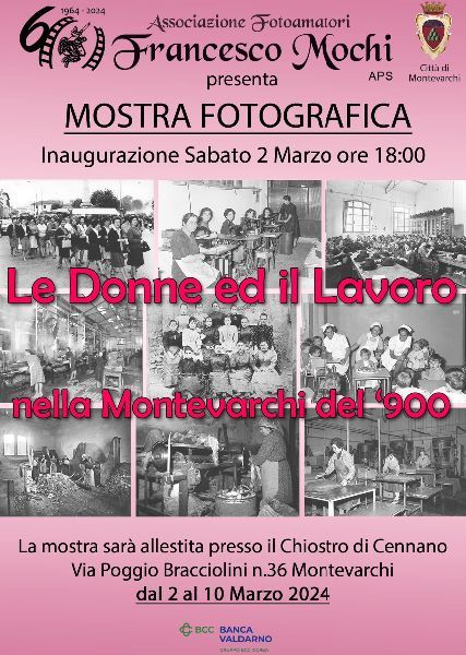 "Le Donne ed il Lavoro nella Montevarchi del ‘900" è il titolo della mostra fotografica allestita in occasione delle celebrazioni per la “Giornata Internazionale della Donna” e nell’ambito delle iniziative per i 60 anni della nostra Associazione; una mostra che documenterà l’importanza e l’evoluzione del lavoro femminile nello sviluppo della nostra città nel secolo scorso.