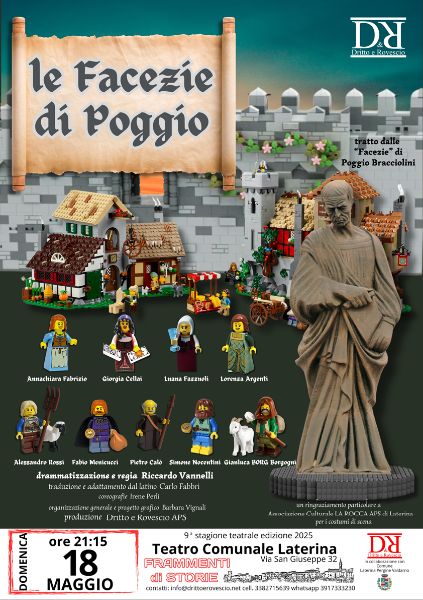 Domenica 18 maggio ore 21:15, posticipato dal 11/05/2025, ultimo appuntamento con la stagione del Teatro Comunale di Laterina: in programma lo spettacolo LE FACEZIE DI POGGIO (tratto dalle “Facezie” di Poggio Bracciolini), drammatizzazione e regia Riccardo Vannelli, assistenti alla regia Simone Nocentini e Annachiara Fabrizio, adattamento e traduzione dal latino di Carlo Fabbri. Costumi di scena Associazione La Rocca APS di Laterina. Produzione Dritto e Rovescio.