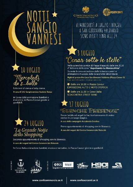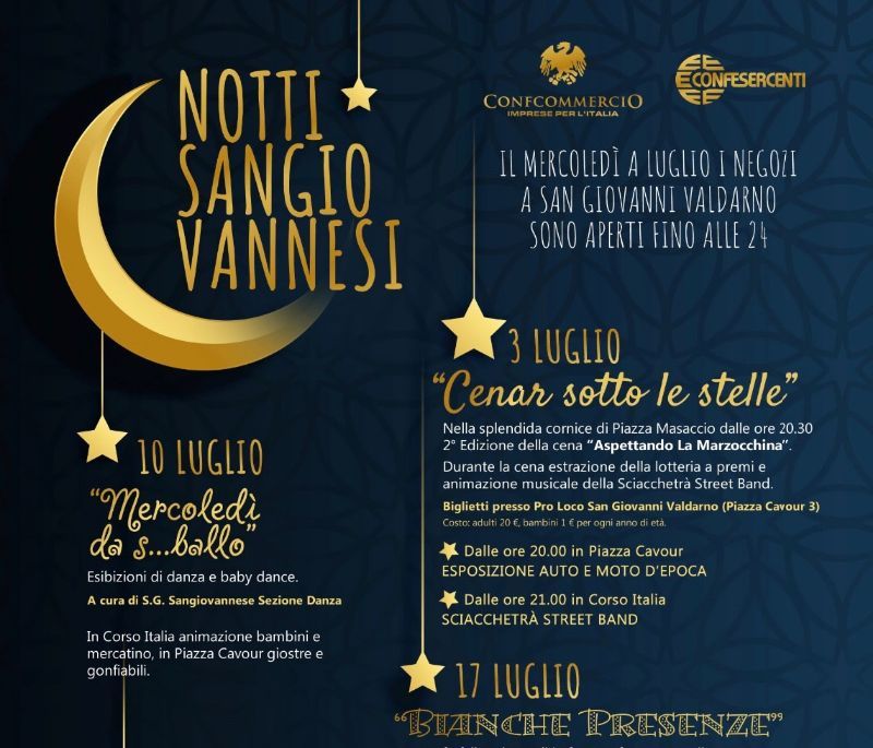 Nel mese di Luglio, in occasione de “I Mercoledì di Luglio”, San Giovanni Valdarno propone numerosi eventi sotto le stelle e aperture serali dei negozi per vivere in allegria le serate estive del centro storico.