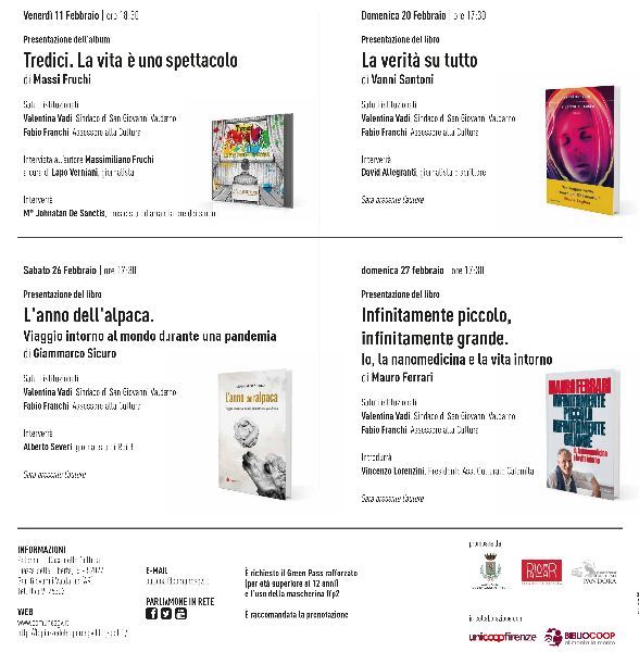 Ogni evento si svolgerà a Palomar, la Casa della cultura di San Giovanni Valdarno. Per partecipare, in ottemperanza alle disposizioni governative, i cittadini di età superiore a 12 anni privi di apposita esenzione medica, dovranno esibire il green pass rafforzato ed indossare la mascherina Ffp2.