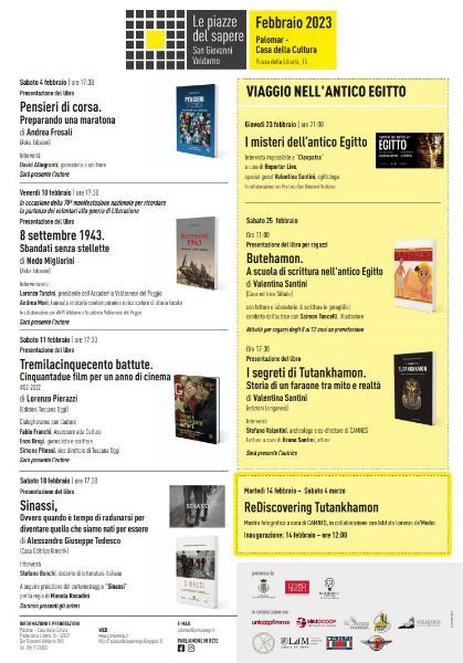 Lo stesso giorno alle 17,30 sarà invece presentato il libro “I segreti di Tutankhamon. Storia di un faraone tra mito e realtà” di Valentina Santini (edizioni Longanesi). Interverrà Stefano Valentini, archeologo e co-direttore di Camnes.