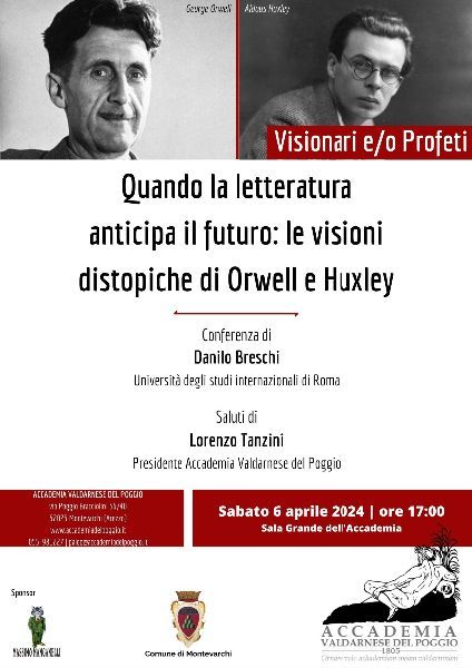 Sabato 6 aprile, alle ore 17:00 nella Sala Grande dell’Accademia, avremo il piacere di ascoltare Danilo Breschi (Università degli studi internazionali di Roma) con una conferenza dal titolo “Quando la letteratura anticipa il futuro: le visioni distopiche di Orwell e Huxley”.