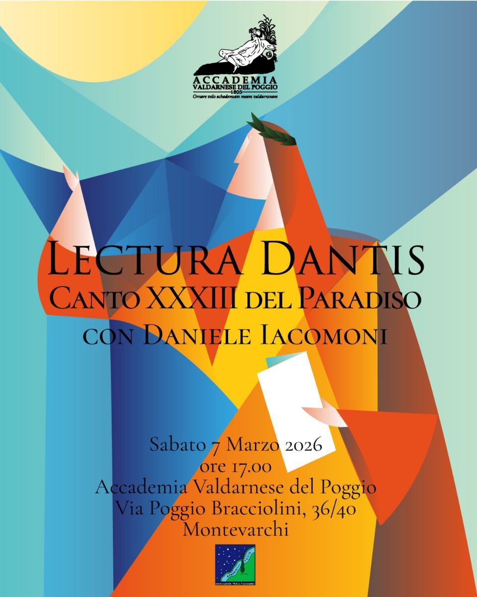 Il mese di marzo, all’Accademia Valdarnese del Poggio di Montevarchi, inizia nel segno di Dante Alighieri: sabato 7, alle ore 17:00 nella Sala Grande, ascolteremo il prof. Daniele Iacomoni (Università dell’età libera – Uniel “Enzo Ficai”, Arezzo; Associazione “per la Valdambra”, Bucine) in una delle sue Lecturae Dantis. Protagnonista sarà il XXXIII Canto del Paradiso.