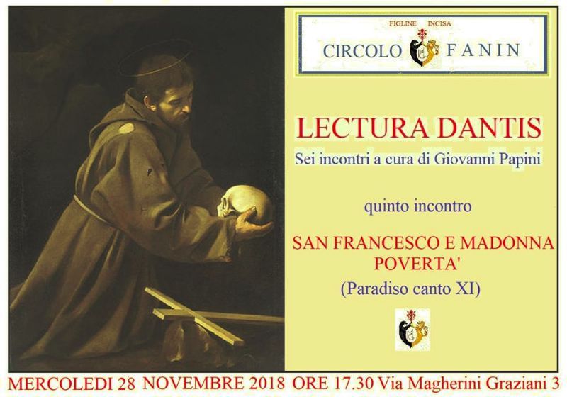 Mercoledì 28 Novembre appuntamento, quindi, alle 17,30 con Giovanni Papini che spiegherà il Canto XI del Paradiso della Divina Commedia incentrato sulla figura di San Francesco.