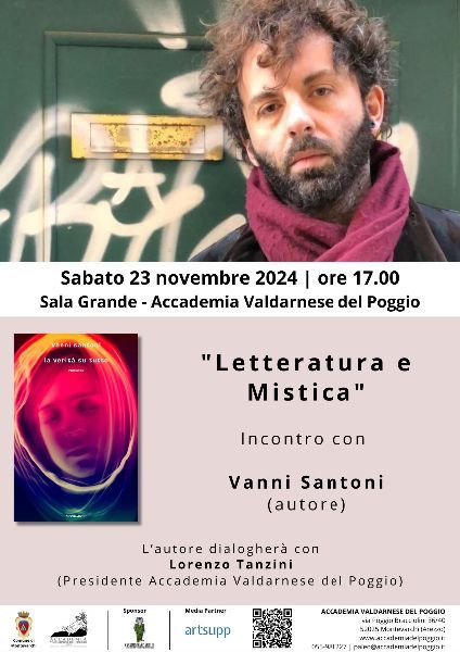 Sabato 23 novembre, alle ore 17:00 nella Sala Grande, l’Accademia Valdarnese del Poggio avrà il grande piacere di ospitare e ascoltare sui temi di Letteratura e Mistica l’autore Vanni Santoni.