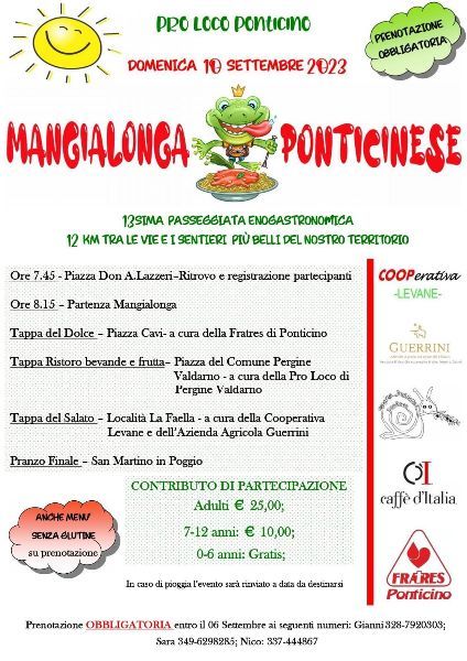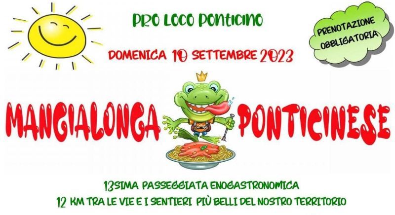 Dopo il rinvio forzato di Giugno, causa meteo avverso, il 10 Settembre viene riproposta la Mangialonga Ponticinese; passeggiata enogastronomica aperta a tutti, organizzata dalla proloco Ponticino