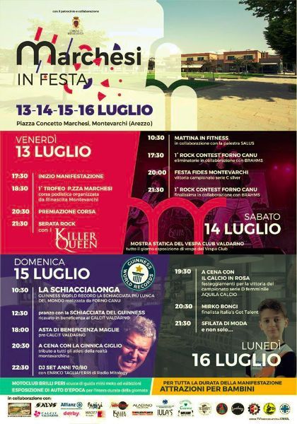 Da Venerdì 13 a Lunedì 16 Luglio in Piazza Concetto Marchesi, a Montevarchi, si svolgerà la manifestazione "Marchesi in Festa" con un programma ricchissimo di eventi sportivi, musicali e di solidarietà. Eccolo:
