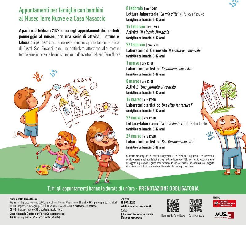 A partire da febbraio 2022 tornano gli appuntamenti del martedì pomeriggio al Museo Terre Nuove e a Casa Masaccio, con una serie di attività, letture e laboratori per bambini. Le proposte prendono spunto dalla ricca storia di Castel San Giovanni con particolare attenzione alle mostre temporanee in corso: al Museo Terre Nuove “Italian best practice. Spazi della comunità” e “Mehr Licht! Più luce!” presso Casa Masaccio.
