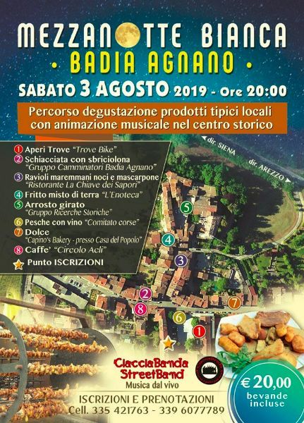 Sabato 3 Agosto a Badia Agnano, splendido borgo nel comune di Bucine (AR), si potrà partecipare alla “Mezzanotte Bianca”, un percorso di degustazione con cena itinerante a base di prodotti tipici locali.