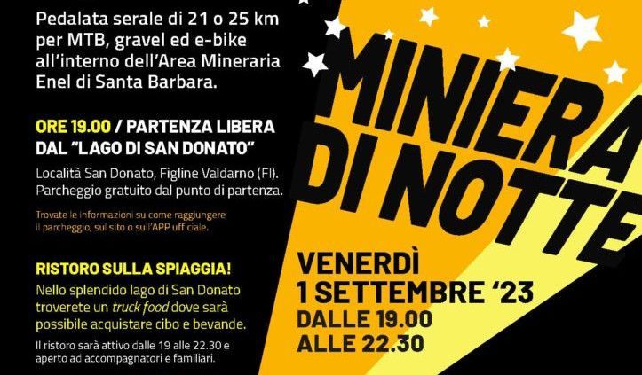 Venerdì 1 Settembre all'interno dell'area mineraria di Santa Barbara, con il patrocinio di Enel, Confcommercio, Comune di Figline e Incisa Valdarno e Banca del Valdarno, si svolgera l'evento: "Miniera di Notte" , una pedalata serale (su prenotazione).