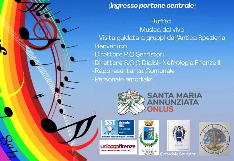 Appuntamento aperto a tutti dalle 18 alle 20.30 con buffet (con cibi adatti a chi è affetto da insufficienza renale), visita guidata a gruppi all'Antica Spezieria del Serristori, musica di intrattenimento dal vivo.