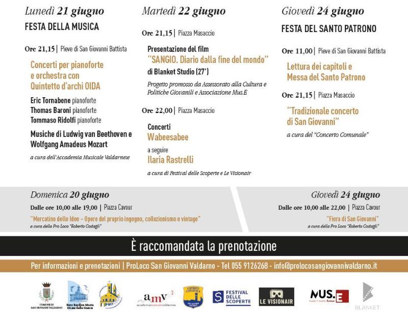 In rispetto della normativa di sicurezza e dei protocolli anti Covid, per ciascuna delle iniziative è fortemente raccomandata la prenotazione, che può essere effettuata scrivendo una mail a info@prolocosangiovannivaldarno.it, chiamando il numero 0559126268, inviando un messaggio al numero 334 3263132 oppure online.