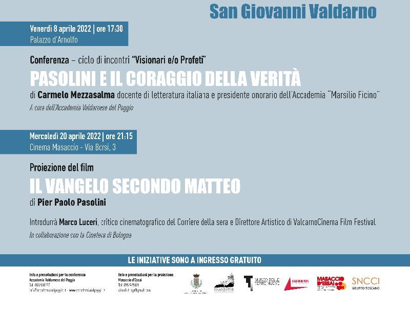 Venerdì 8 Aprile, alle ore 17.30, presso Palazzo d’Arnolfo, conferenza per la rassegna “Visionari e/o Profeti” “Pasolini e il coraggio della verità” di Carmelo Mezzasalma, docente dei letteratura italiana e presidente onorario dell’Accademia “Marsilio Ficino”. Evento a cura dell’Accademia Valdarnese del Poggio.