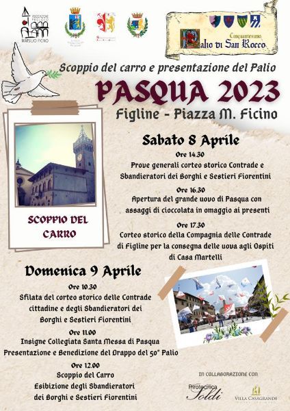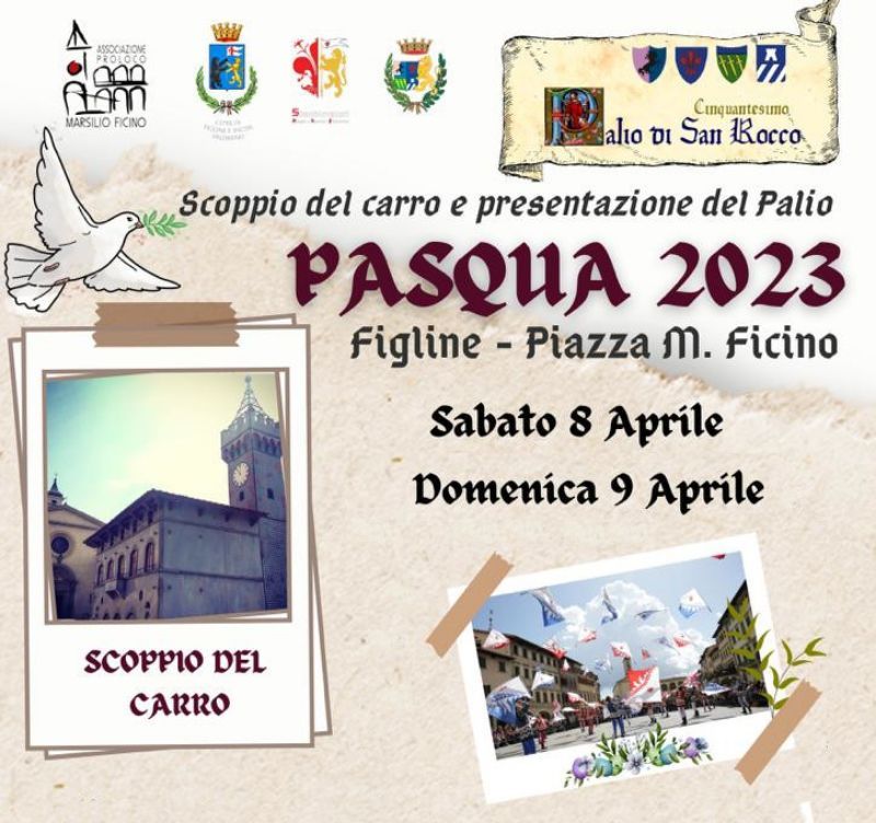 Sabato 8 e Domenica 9 Aprile in piazza Marsilio Ficino, Figline Valdarno, si celebra la Pasqua 2023 con il corteo storico delle Contrade, lo scoppio del Carro, lo spettacolo degli Sbandieratori e la Santa messa di benedizione del drappo per il 50° Palio di San Rocco; manifestazioni organizzate da Proloco Marsilio Ficino, Sbandieratori dei Borghi e Sestieri fiorentini e Compagnia delle Contrade di Figline, in collaborazione con Villa Casagrande e Pirotecnica Soldi.