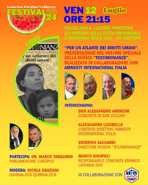 IN PIAZZA DON A. LAZZERI, PONTICINO ALL'INTERNO DELLA FESTA PROVINCIALE E REGIONALE DELLE ACLI - XIX EDIZIONE, SI TERRÀ LA PRESENTAZIONE DEL VOLUME SPECIALE DELLA RIVISTA “TESTIMONIANZE”, REALIZZATO IN COLLABORAZIONE CON AMNESTY INTERNATIONAL ITALIA : “PER UN ATLANTE DEI DIRITTI UMANI”.