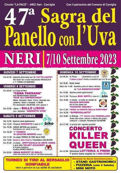 Il culmine della Festa sarà domenica 10 settembre con il concerto dei Killer Queen alle ore 21, l'XI edizione della “Porcellata” e l'”Aperivolante”.