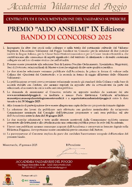 Giunge alla IX Edizione il Premio “Aldo Anselmi”, Concorso che L’Accademia Valdarnese del Poggio, con il Patrocinio del Comune di Montevarchi, bandisce con cadenza biennale.