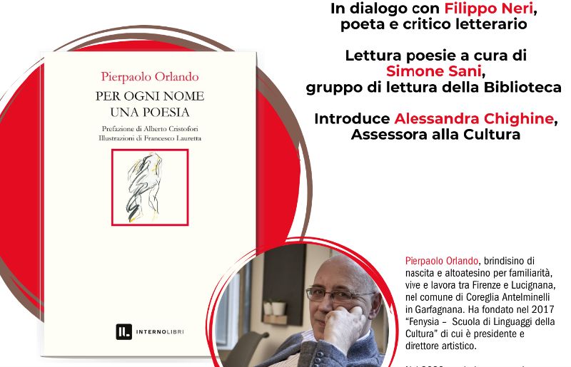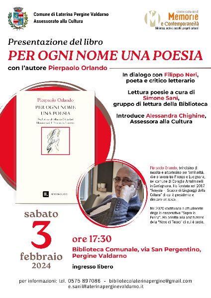 Sabato 3 febbraio 2024, alle ore 17:30, la Biblioteca Comunale di Laterina Pergine Valdarno, ospiterà la presentazione del libro “Per ogni nome una poesia” (Interno Libri Edizioni, 2022) del poeta Pierpaolo Orlando; l’autore dialogherà con Filippo Neri.