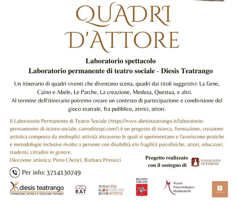 Domenica 23 marzo, alle ore 16.30 al Museo Paleontologico di Montevarchi, si terrà il laboratorio spettacolo 'Quadri d'attore' a cura della compagnia teatrale 'Diesis Teatrango', con la direzione artistica di Piero Cherici e Barbara Petrucci.