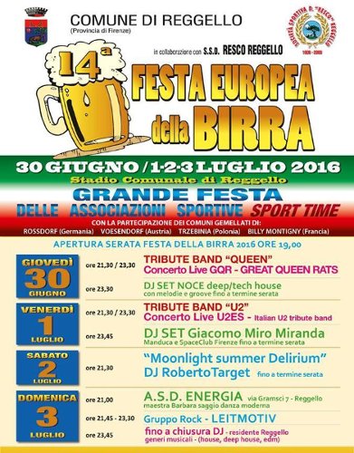 Il 30 giugno e 1-2 e 3 luglio, allo Stadio comunale del capoluogo ci sarà la XIV edizione della Festa Europea della Birra, organizzata dal Comune con la collaborazione della S.S.D. Resco Reggello.