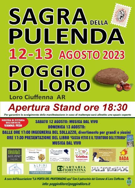 A Poggio di Loro Borgo medioevale, situato alle pendici del Pratomagno a 626 m. di altitudine, quindi al fresco del Pratomagno, torna la sagra della Pulenda, Sabato 12 e Domenica 13 Agosto.