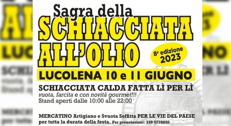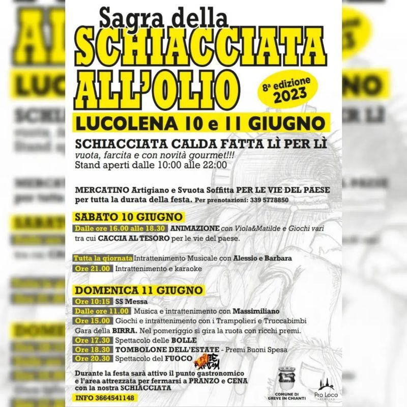 Sabato 10 e domenica 11 giugno torna la “Sagra della Schiacciata con l’Olio” nel borgo di Lucolena, giunta alla sua 8a edizione ed organizzata dalla Pro-Loco Lucolena e dal Comune di Greve in Chianti.