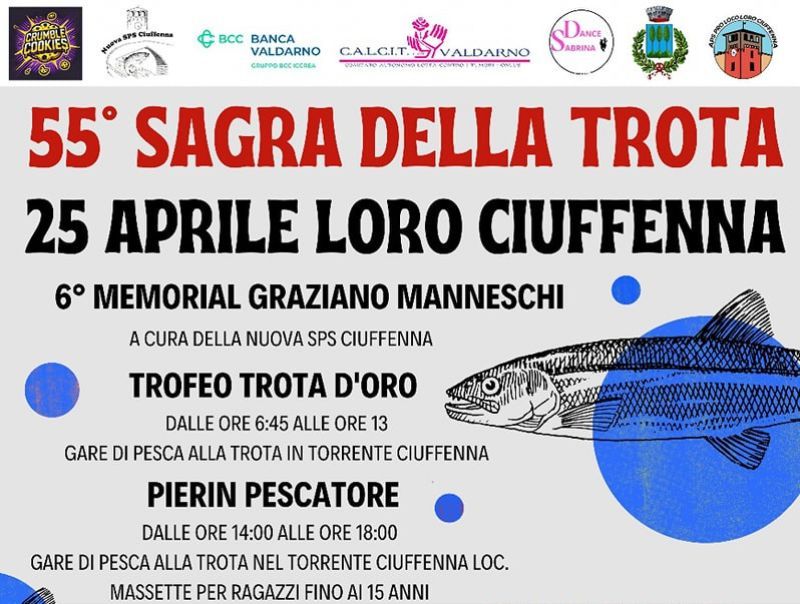Venerdì 25 Aprile appuntamento a Loro Ciuffenna con la 55° edizione della Sagra della Trota; durante l'intera giornata, in piazza Garibaldi, troverete lo stand gastronomico della Pro Loco Loro Ciuffenna in cui potrete gustare antipasti e trota alla griglia (anche da asporto!)