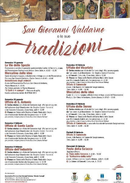 Nei mesi di Gennaio e Febbraio, a San Giovanni Valdarno, si svolgerà la rassegna intitolata “San Giovanni Valdarno e le sue tradizioni”. Il ciclo di appuntamenti avrà inizio Domenica 19 Gennaio con “La Via delle Spezie e del Tradizionale Stufato alla Sangiovannese”, il Mercatino delle Idee, la Benedizione degli animali e la Conferenza Assaggi di cucina medievale a cura della Dott.ssa Antonella Campanini, durante la quale sarà approfondita l’origine storica, sociale e culturale dello stufato.
