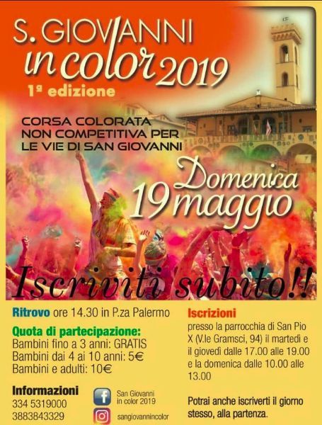 Domenica 19 Maggio San Giovanni Valdarno si colora con la prima edizione della “San Giovanni in Color”, la corsa colorata non competitiva che si snoderà per le vie del centro.