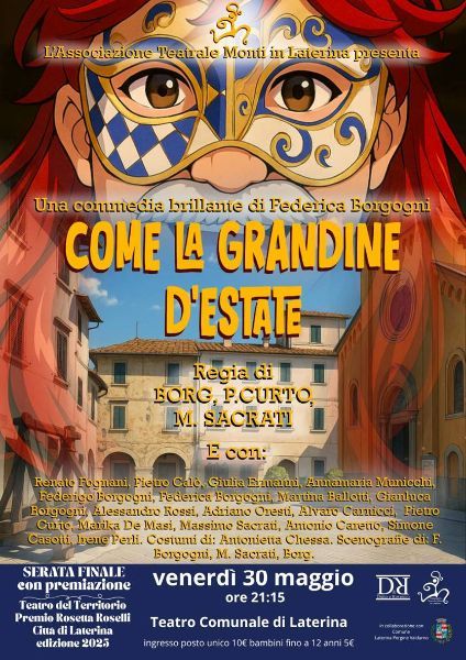 Sul palco la compagnia organizzatrice porterà in scena, in prima assoluta il suo ultimo spettacolo “Come la grandine d’estate” con la regia di Gianluca BORG Borgogni, Pietro Curto e Massimo Sacrati. Una commedia brillante in due atti in cui il vero protagonista è il sottile confine tra apparenza e realtà, essere ed apparire. Fa da cornice un piccolo paese di provincia, immerso nella campagna toscana, in cui si racconta una giornata semplice ma concitata della vita dei suoi abitanti.