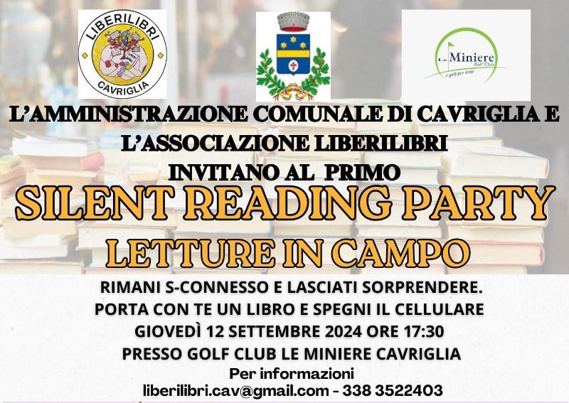 Giovedì 12 settembre alle 17 e 30 presso le "Miniere Golf Club" si svolgerà il primo Silent Reading Party, fortemente voluto dall'Amministrazione Comunale e dall'Associazione LiberiLibri&LiberiScacchi.