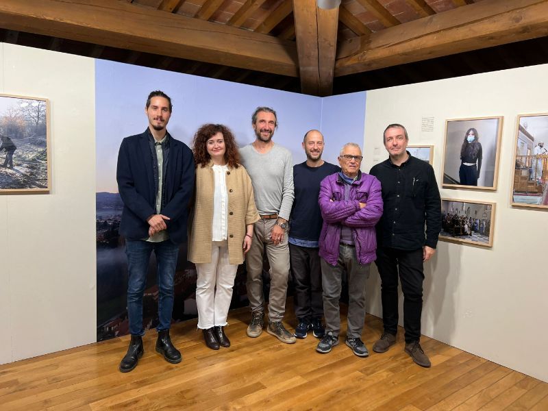 la sindaca Giulia Mugnai, l'assessore alla Cultura Dario Picchioni, tre dei quattro fotografi di Terraproject (Simone Donati, Pietro Paolini e Rocco Rorandelli) ed Edo Mugnai, socio del Circolo fotografico Arno, alcune delle foto in mostra e un esempio di didascalia firmata da Vanni Santoni