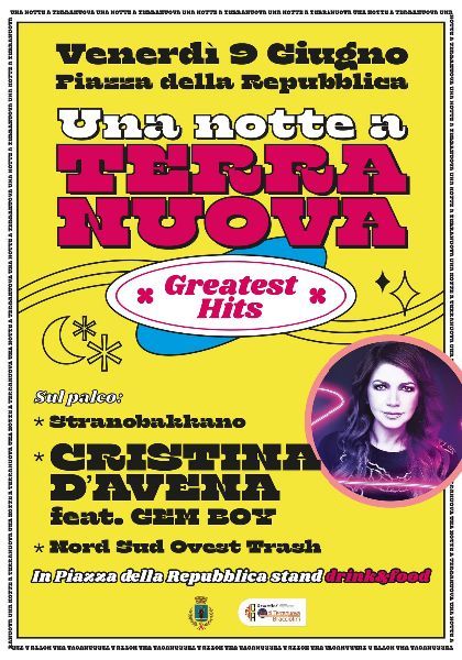 Ecco il programma completo del 9 giugno, dove non potevano mancare gli Stranobakkano, che ci hanno accompagnato in tutte o quasi le edizioni di Una notte a Terranuova, che apriranno il concerto di Cristina D'Avena, poi ancora Gem Boy e nordsudovesttrash in Piazza Dell Repubblica, Terranuova Bracciolini.
