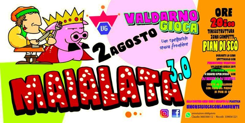 - ore 20.00; Cena-evento “LA MAIALATA 3.0: LA MEDIEVALATA” presso la Tensostruttura nella zona campetti a Piandiscò, con piatti tipici valdarnesi, premiazione vincitori, estrazione lotteria e tanto spettacolo;