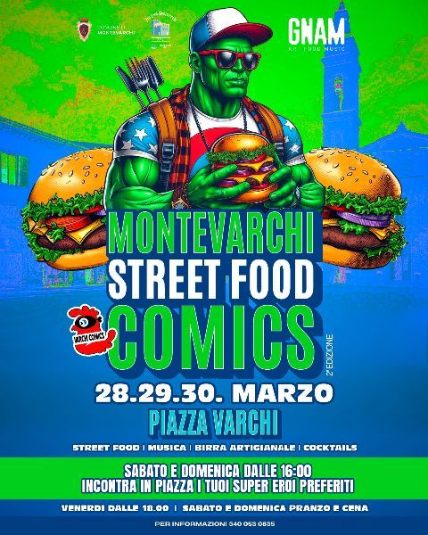 Piazza Varchi come area di street food e intrattenimento “Montevarchi street food comics”, a cura della Proloco Montevarchi, con truck food, schiacciate toscane farcite, arrosticini , lampredotto, pesce, in un’area tavoli aperta dalle 12.00 fino alle 24, venerdì 28 marzo a partire dalle ore 18.00.