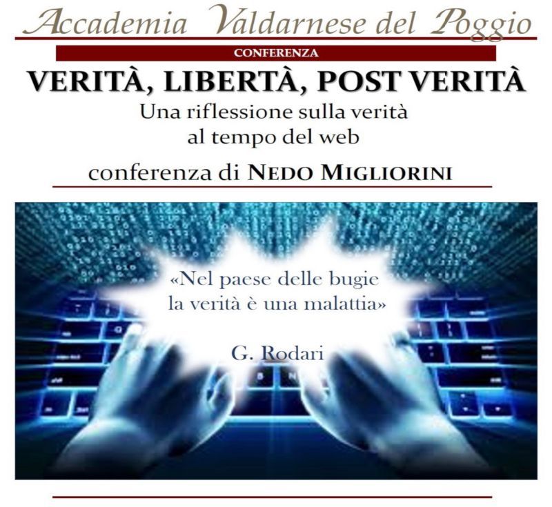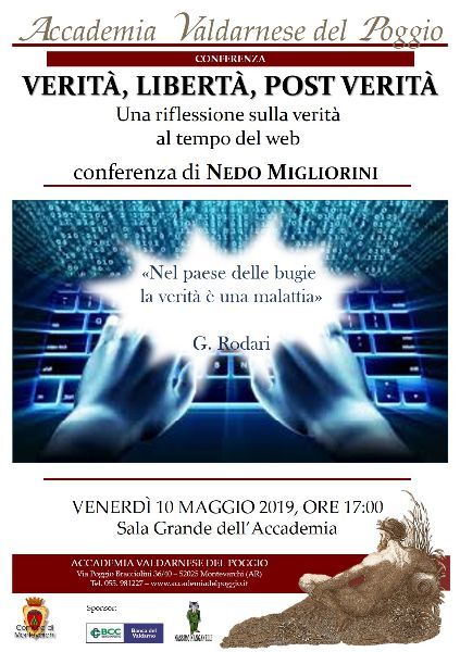 Venerdì 10 Maggio, alle ore 17:00, presso la Sala Grande dell’Accademia Valdarnese del Poggio a Montevarchi, si terrà la conferenza “Verità, Libertà, Post Verità”.