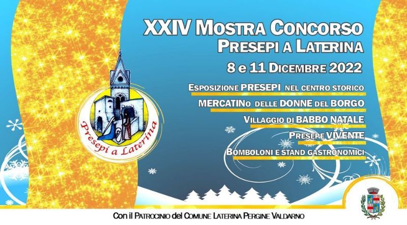 Da giovedì 8 Dicembre, in occasione della festa dell'immacolata, nel centro di Laterina, si terrà la tradizionale esposizione dei presepi Natalizi, il presepe vivente di Laterina, e i tradizionali mercatini delle Donne del Borgo.